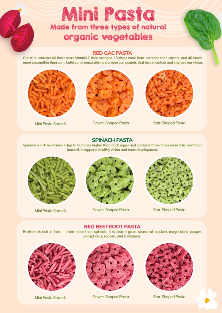 Made entirely from natural spinach juice, the mini spinach pasta contains no artificial colors and is rich in Vitamin K, essential for your baby’s development. Notably, the folic acid content in the spinach is three times higher than that of broccoli, supporting comprehensive brain and nervous system development.